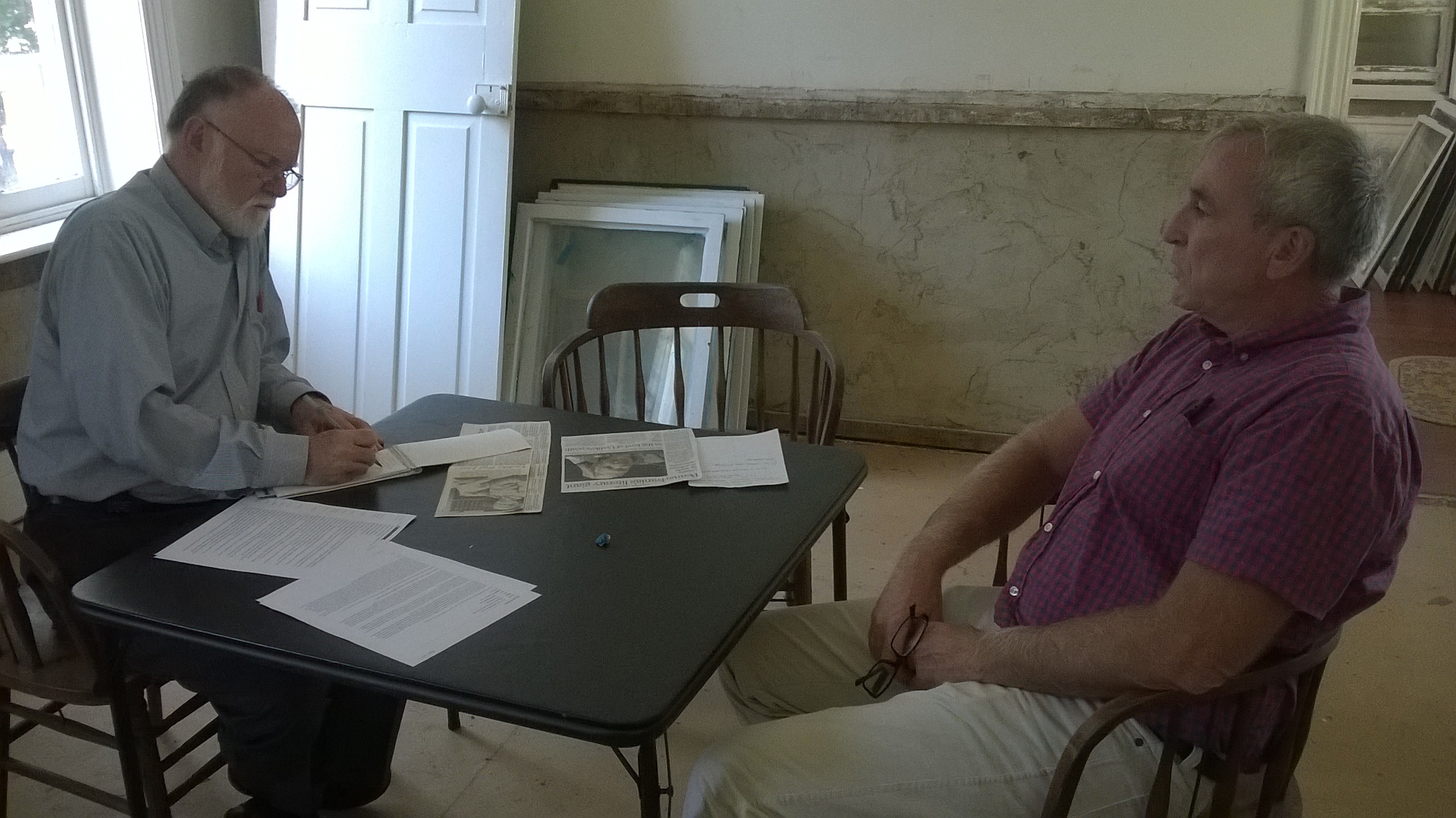 Phase 3 involves the addition of a grape arbor that was there prior to 1945 when the Updikes moved to Plowville, and the addition of decorative exterior corbels that had been removed to make repainting cheaper/easier. The kitchen and second-floor bathroom will also be upgraded to be period, but functional, during this phase. Below Reading Eagle reporter Bruce Posten (l) questions Robert Doerr for the article as they sit in the “deconstructed” dining room.