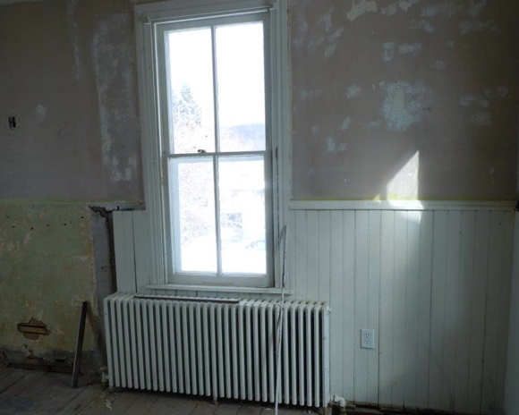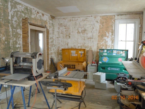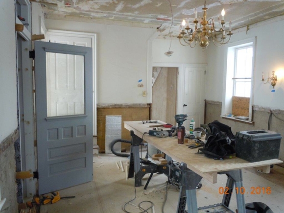 Workers from R. J. Doerr are set up for some serious work in the parlor of The John Updike Childhood Home (top) and living room (top middle). They have already reinstalled a dining room door that had been converted into bookshelves (bottom middle). Work is moving along well, says Doerr, who verified that the wainscoting in Updike’s bedroom is original and would have been there when Updike used the room.