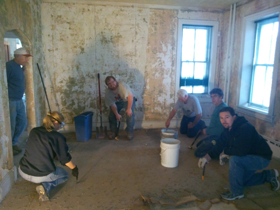 Habitat for Humanity of Berks County volunteers tearing out modern flooring and scraping wallpaper.